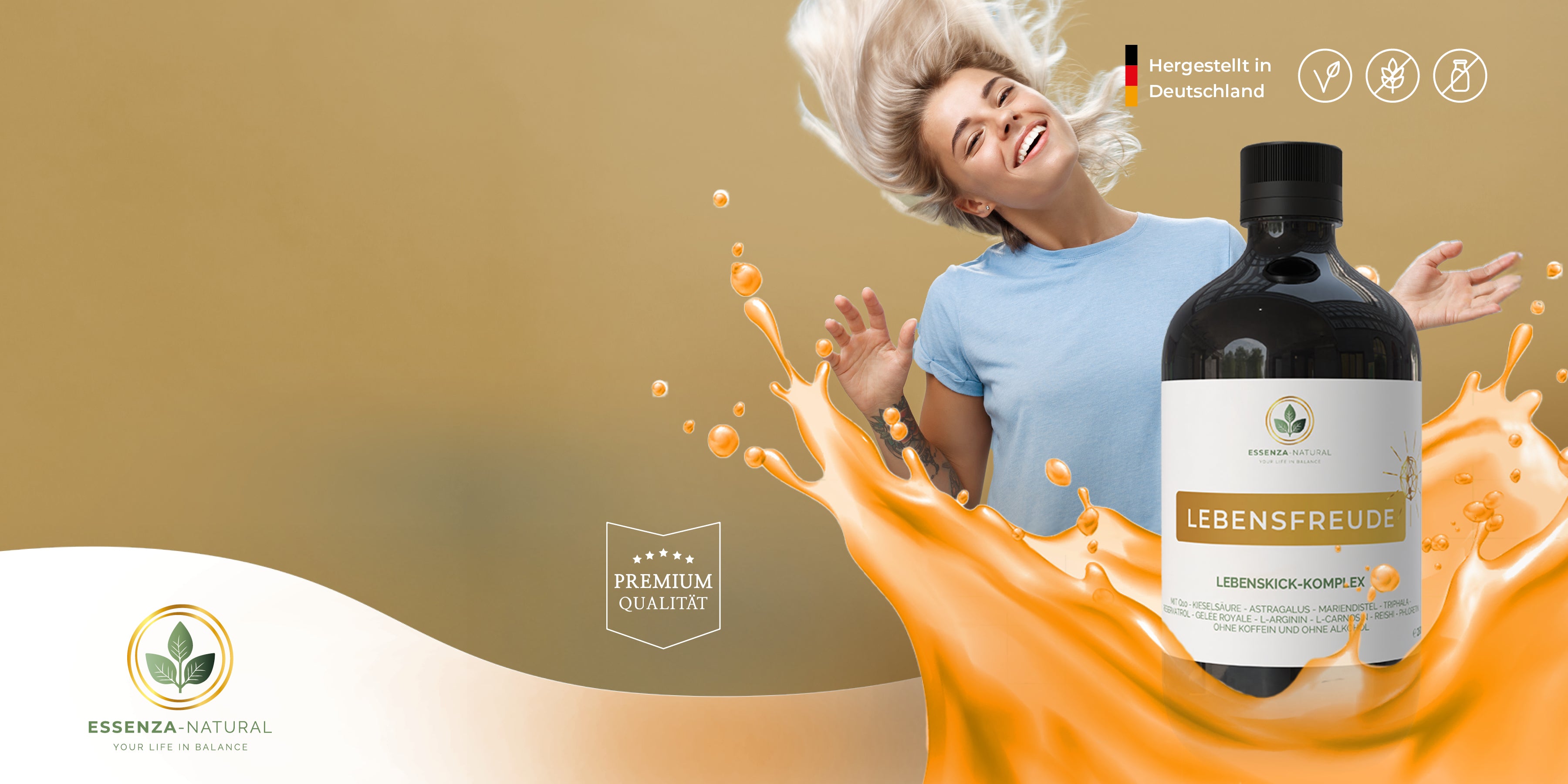 LEBENSFREUDE oder IMMUNSTARK von ESSENZA-NATURAL sind mehr als nur ein Nahrungsergänzungsmittel. Sie sind wie ein Sonnenschein aus der Flasche, der Dich mit ausgesuchten Vitaminen und wertvollen Pflanzenstoffen begleitet. Ein Glas Wasser, ein bewusster Atemzug und Deine morgendliche Dosis LEBENSFREUDE oder IMMUNSTARK können Dir helfen, mit mehr Energie, innerer Balance und einem Gefühl von Vitalität durchzustarten.